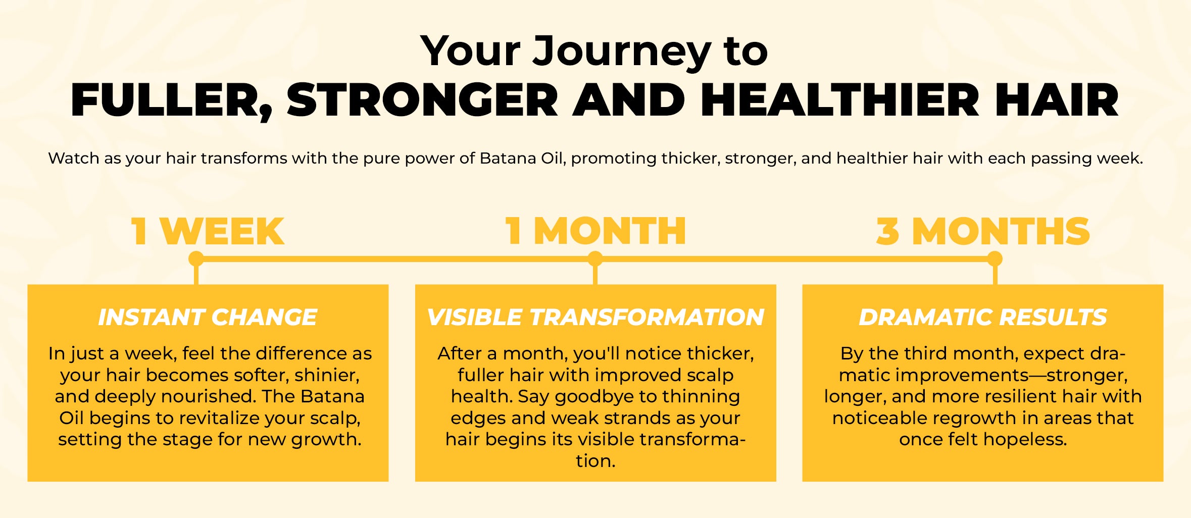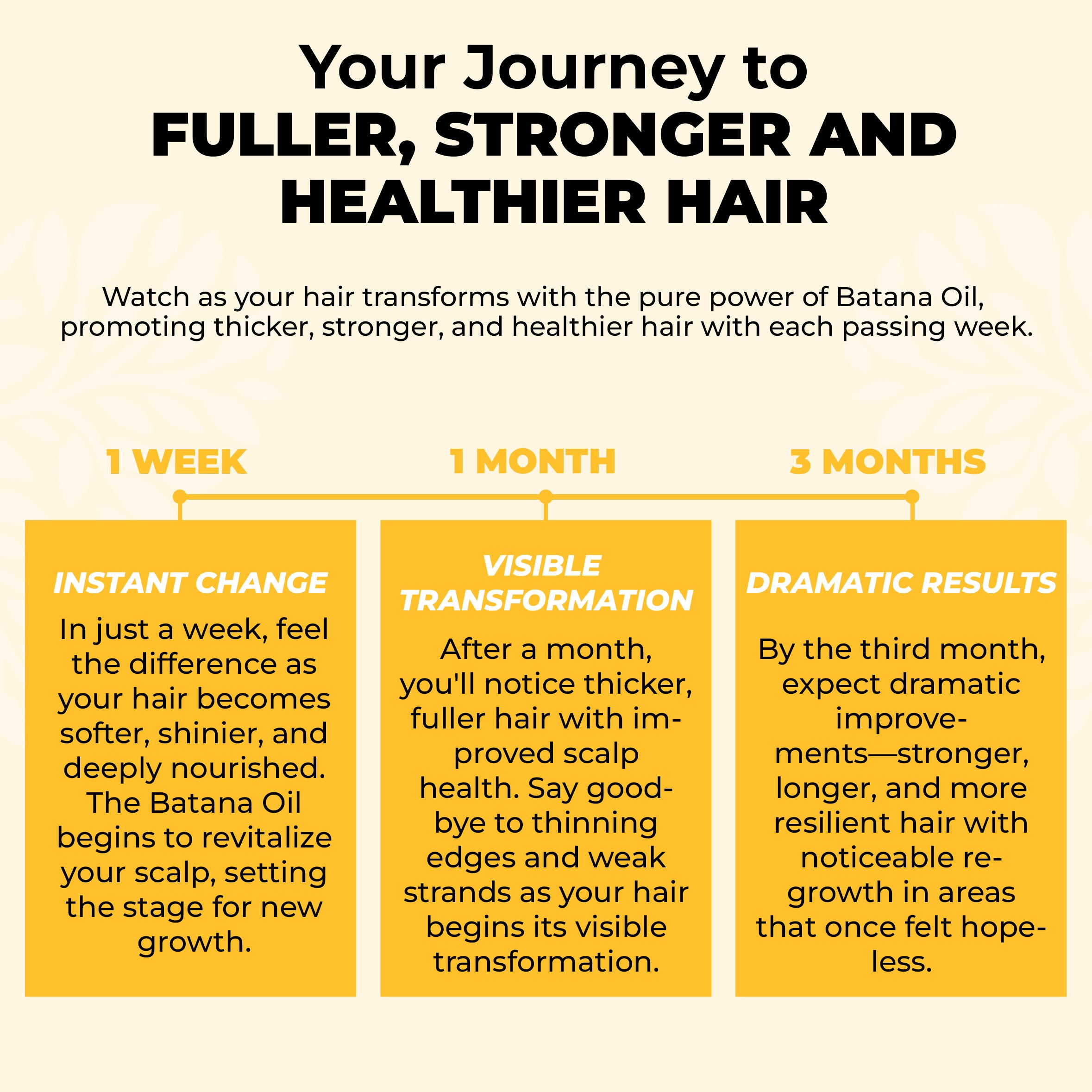 Rich in essential nutrients, our Batana Oil supports collagen production, enhancing your hair’s elasticity and reducing breakage. With continued use, your hair becomes visibly stronger and more resilient.
