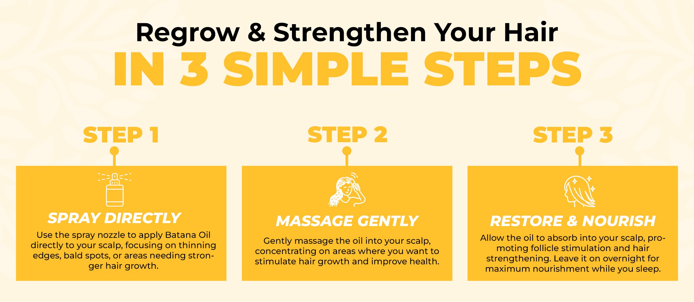 You can apply Batana Oil Spray to freshly washed hair or slightly damp hair. Ensure your hair is free from other products like gels or hairsprays to allow the oil to penetrate properly.
