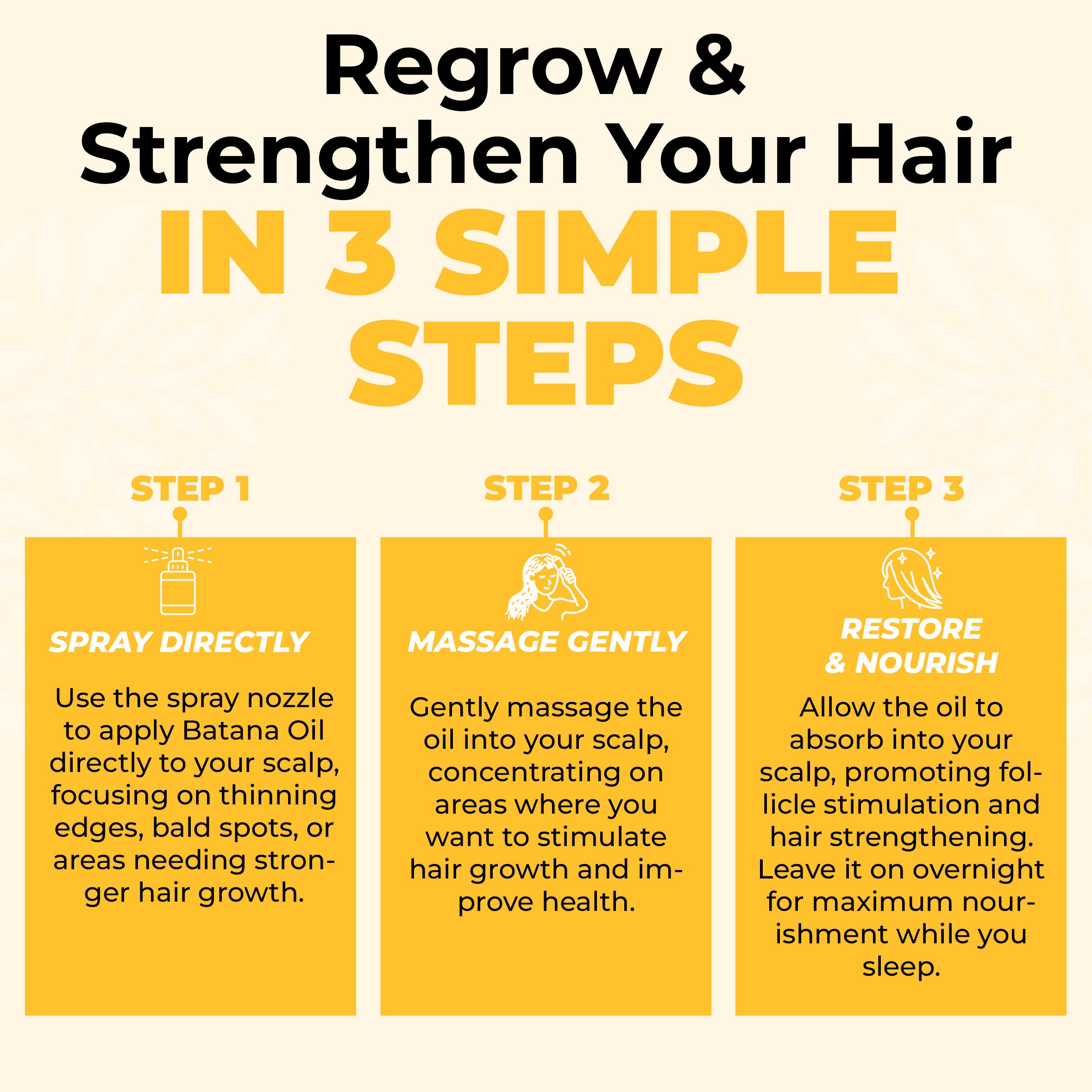 The quantity of Batana Oil Spray you need depends on your hair length and thickness. Spray the oil evenly across your scalp and hair, making sure to cover all the areas that need treatment.