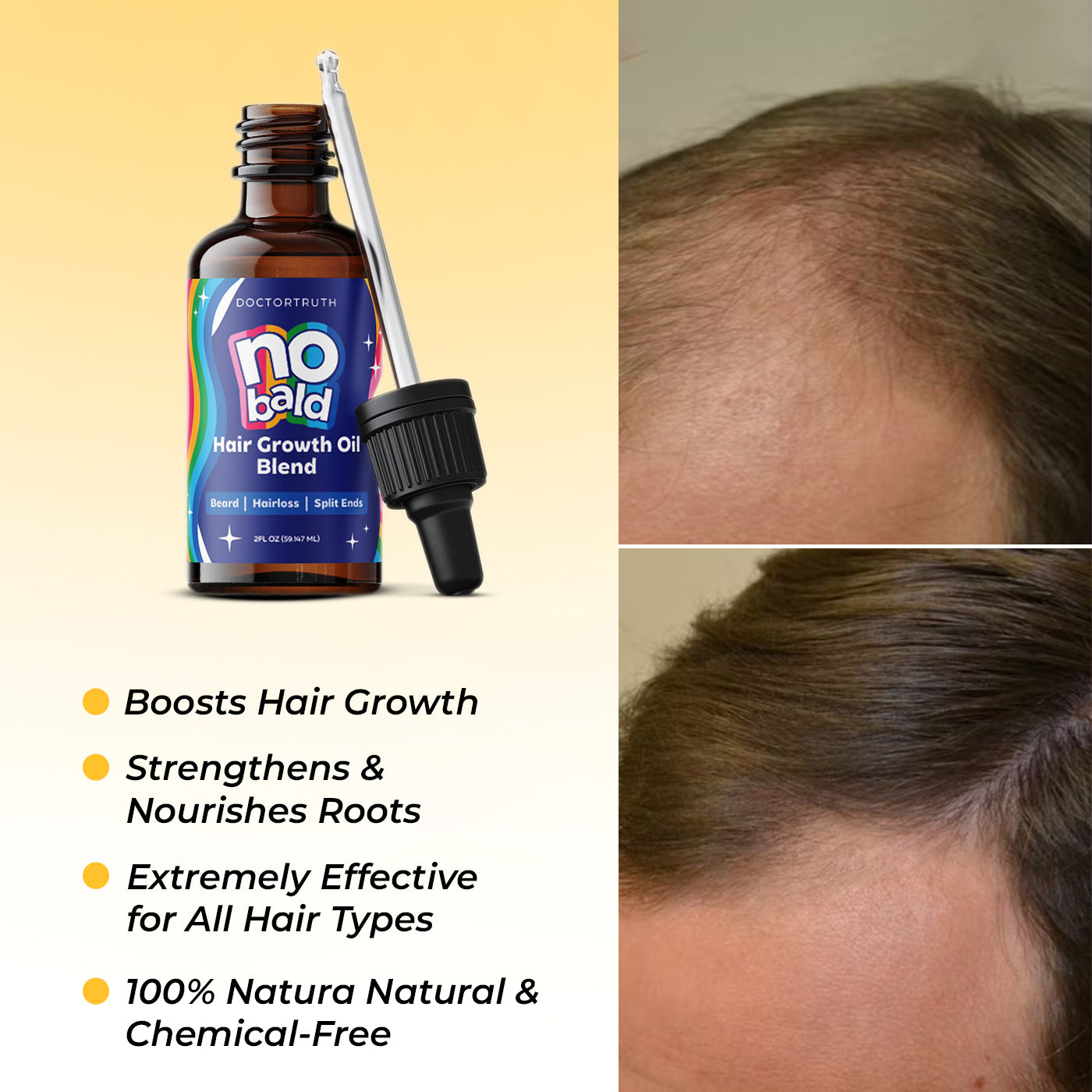 DoctorTruth’s NoBald™ 3-in-1 Hair Growth Oil is perfect for all hair types, especially for those with sensitive scalps. Free from harsh chemicals, it soothes, hydrates, and nourishes your hair—promoting natural growth without irritation.